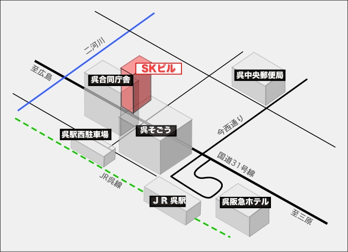 呉駅正面出口から左方向にゆきます。呉そごう角を左折し、国道31号線にそって次の信号まですすみます。斜向かいにハローワークがありますのが、その西隣のエスケイビルの6階になります。