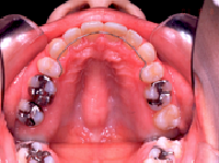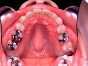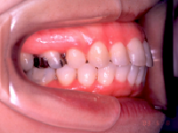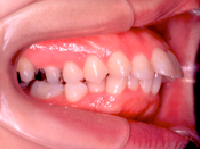 治療前 いわゆる出歯さんですが、特に上の前歯が出ていることで、口が閉じにくく、無理に閉じると下の唇が前に出て、口元がとんがって見えます。 治療前 上顎 この不正咬合を引き起こす原因のなかでも比較的多いのは、鼻詰まりです。これにより鼻の骨ひいては上顎の成長が悪く、狭くなってしまいます。その結果、上顎の歯列弓形の形がV字型(正常はU字型)になり、さらにこの狭い上顎にあわせて咬もうとするために、下顎を後ろにずらさないとうまく咬めないという悪循環が起きるといわれています。 治療後 抜歯する歯は、上の歯だけですが、左右の4番目の歯(=第一小臼歯)です。この抜歯スペースを利用して前歯を引っ込めるだけでなく横顔も改善します。 治療後 上顎 狭い上顎は、できるだけ広げてゆくのが理想ですが、すでに思春期成長が終わっている場合には、骨ごと顎を広げるのがりそうことができませんので、横の方の歯(側方歯といいます)を外に押し広げながら、また抜いたスペースを利用して、前歯を引っ込めながら治してゆきます。下顎の歯は抜かずにやっていますが、ガタガタがひどい場合には、抜くこともあります。 叢生 Crowding 八重歯に代表される、歯がガタガタして乱ぐい状態になっているケースです。 上顎前突 上の歯が前に出ているケースですが、下顎が後ろに引けていることもあります。 下顎前突 いわゆる受け口といわています。 開咬 上下の歯に隙間があり、そこだけ咬んでいないケースです。発音にも影響があります。 顎変形症 骨のずれが大きく、手術を併用しなければ治せないケースです。健康保険が効きます。